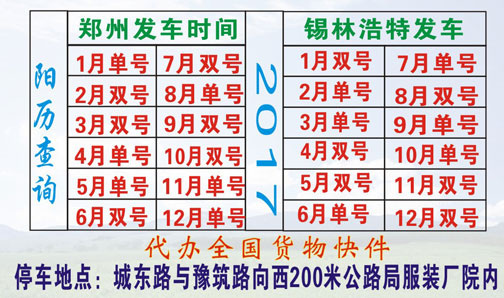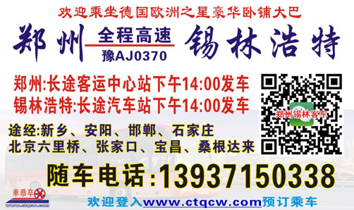 鄭州到錫林浩特客運(yùn)班車,全程高速,鄭州長途客運(yùn)中心站下午14:00發(fā)車,錫林浩特長途汽車站下午14:00發(fā)車,途經(jīng):新鄉(xiāng)、安陽、邯鄲、石家莊、北京六里橋、張家口、寶昌、桑根達(dá)來,車號(hào):豫AJ0370,隨車電話:15538271666,15538271999,停車地點(diǎn):城東路與豫筑路向西200米公路局服裝廠院內(nèi),代辦全國貨物快件,投訴咨詢電話15538271999,長途汽車網(wǎng)提供更多隨車電話查詢